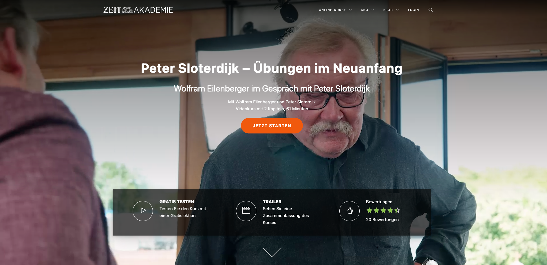 Pressebeiträge Veröffentlicht am 12. November 2025 Kurs: Peter Sloterdijk – Übungen im Neuanfang von Die Zeit zeitakademie.de – Mit Wolfram Eilenberger und Peter Sloterdijk – Videokurs mit 2 Kapiteln, 61 Minuten